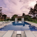 Located in a verdant setting in the Mijas hills, this sprawling villa has been designed in the context of a winding river. Architect Marion Regitko organised the house in one meandering form made of natural stone, creating three volumes with an open space interwoven between them hence its name: El Meandro.