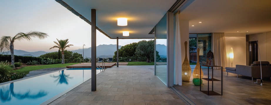 Sitting on top of the hill, the first volume contains the main living, dining and kitchen area, in an open plan with spectacular sea and mountain views. The living space extends into the exterior, blending into the deck and swimming pool area and south-west garden. A large, over-sailing roof connects the inside and outside, and protects the interior from the summer sun.