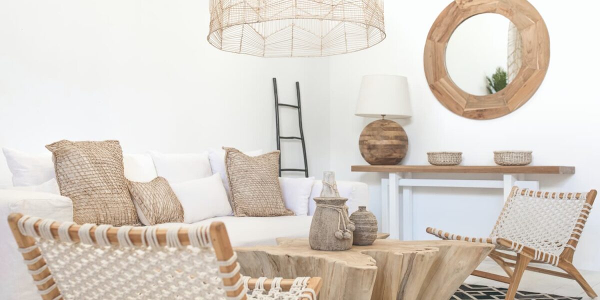 For a natural Scandinavian feel, this living room by New Life Home is adorned with furniture pieces made from recycled teak. The upholstery, all from a white colour palette, complements the natural wood, creating a fresh and timeless look. Everything shown here is from New Life Home in Avda. de Velázquez in Málaga, or shop online at www.newlifehome.es.