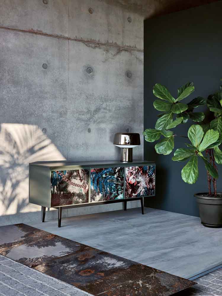 The minimalist Gentis sideboard by Hülsta offers pure luxury, combining elegant lacquer with angular knotted wood. The clever LED illumination makes this cabinet look like it is almost floating. Available from VIP Environment in CC Atenea in Estepona (www.vip-environment.com).