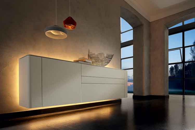 The minimalist Gentis sideboard by Hülsta offers pure luxury, combining elegant lacquer with angular knotted wood. The clever LED illumination makes this cabinet look like it is almost floating. Available from VIP Environment in CC Atenea in Estepona (www.vip-environment.com).