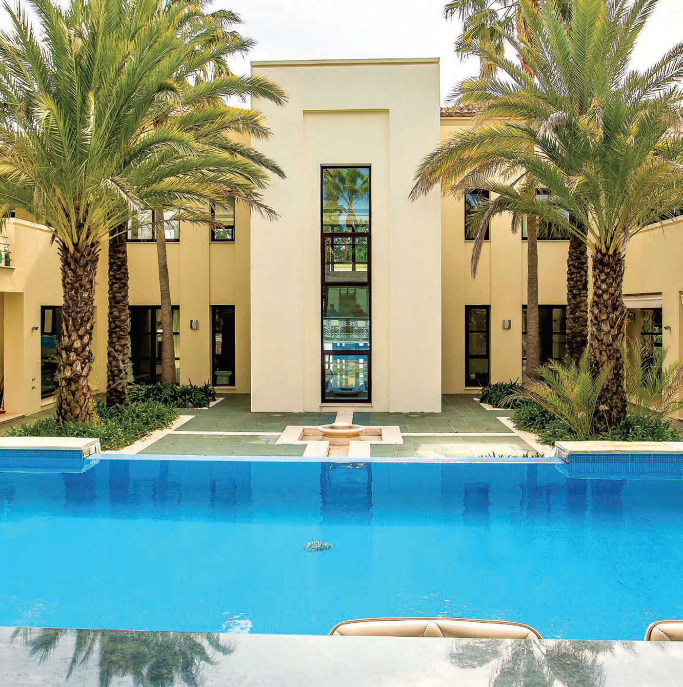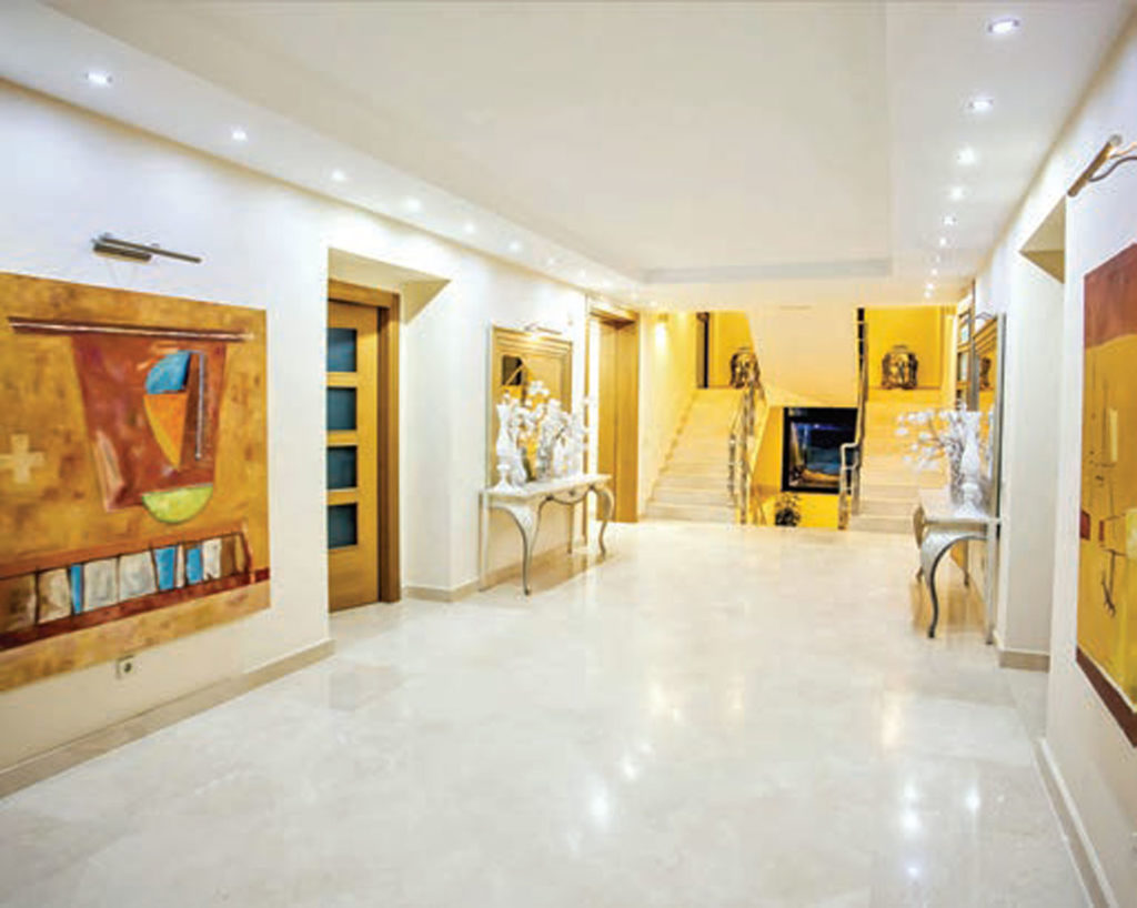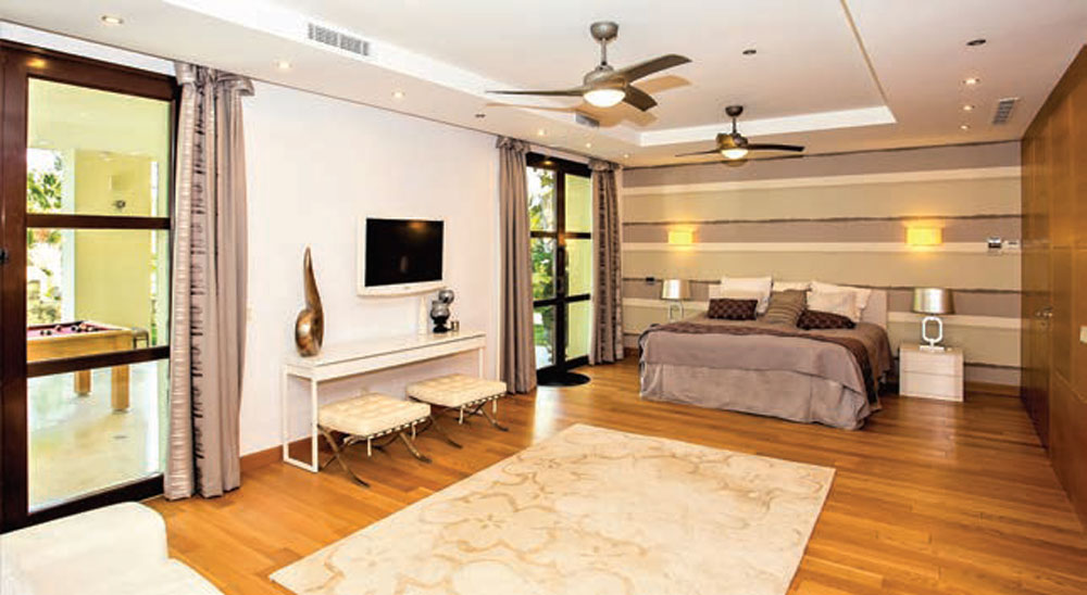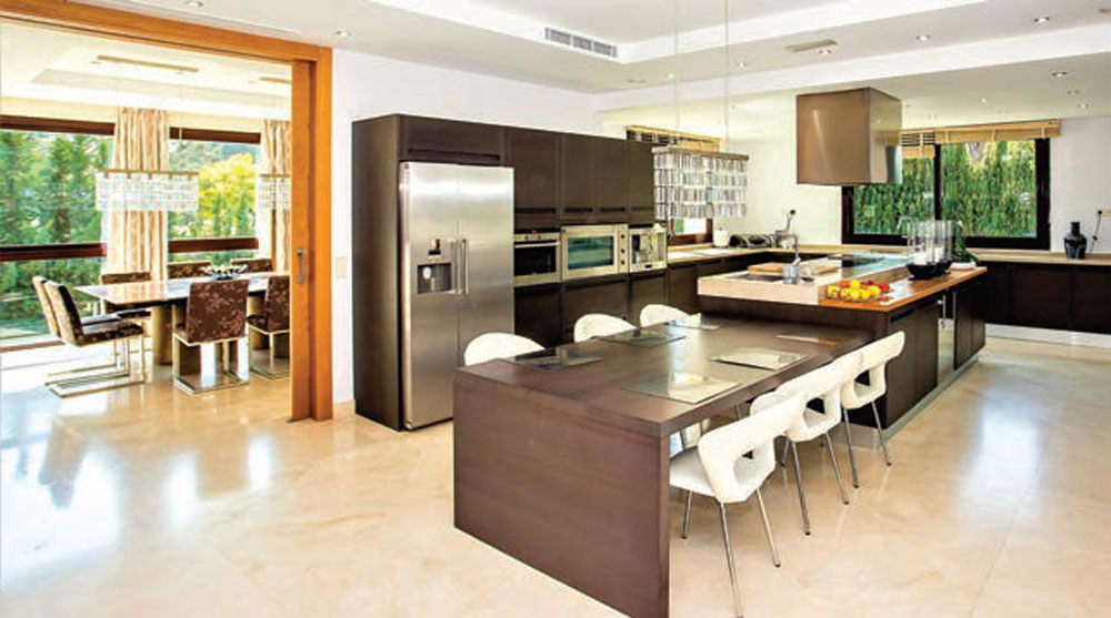 This family home has seven bedrooms in total, with five en suite bathrooms and six additional toilets. Its magnificent kitchen is equipped with an island hob and an adjoining dining table for casual dining. Next to the kitchen you will find a large dining room area which also enjoys views to the outdoors. One other charming feature to this home is an integral twobedroom apartment with its own kitchen, bathroom and separate entrance, ideal for guests when they come to visit. There is a large heated infinity swimming pool (which is chlorine-free) and a fully equipped gym. The whole house has central heating and air-conditioning and there is also under-floor heating and highspeed fibre optic Wi-Fi.