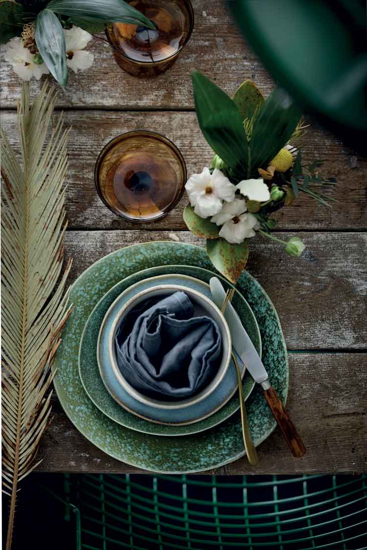 HK Living’s tableware range is rustic but with a contemporary edge. Combining earthy green crockery and irregular edges with stunning amber-coloured tumblers makes it a perfect match for any table. Available from Siesta Interior Design in C. Plaza in Nueva Andalucía (www.siestainteriordesign.com).