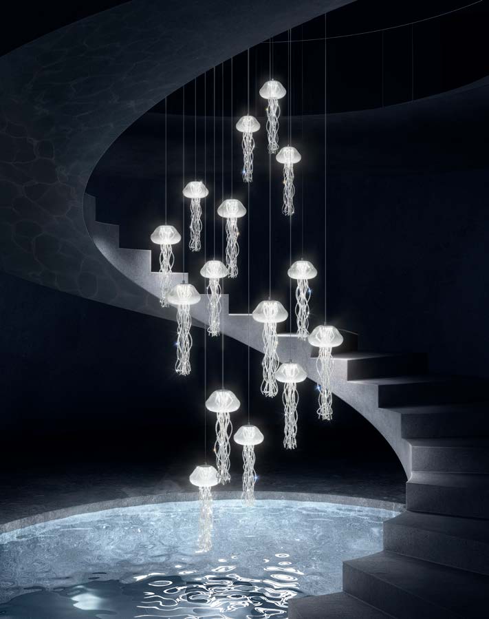 The Medusa collection by Marchetti is made from pearlescent blown glass embellished with reflective drops that float in the air, like a jellyfish in the ocean (www.marchettiilluminazione.com) . LZF’s Big Bird and its smaller sibling Birdy were de signed by award-winning artist Isidro Ferrer and produced using a classic wood-carving technique called “vareta”, in collaboration with master artisan Manolo Martin from Fallas (Valencia). The contempo