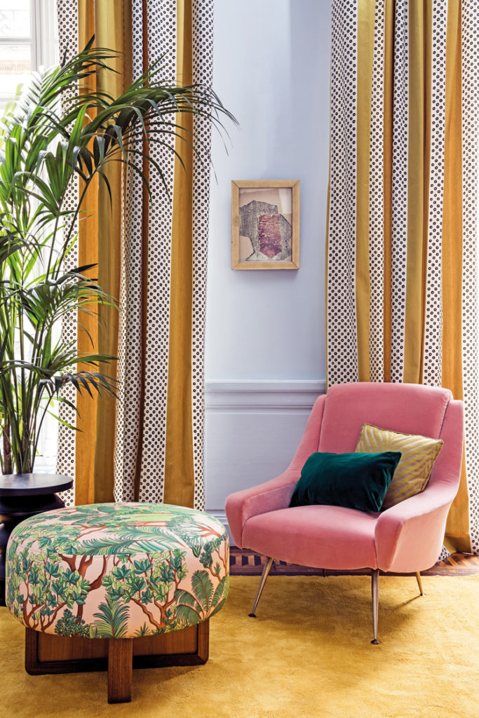 The Umbria Tinto curtain fabric from Création Baumann is thick with a digital print in rich eye-catching colours. Available from Femont Galvan in the Marbella Club (www. femontgalvan.com), UDesign on the Ronda Road (www.udesign.es), Nezha Kanouni in Pol. Ind. Estepona and Marmorin Build & Design Center in Marbella (www.nezhakanouni.com) and Arte del Lusso in San Pedro de Alcántara (www.artedellusso.es).