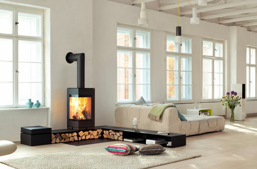 The Balance stove woodburner evolves from a solid fuel stove into a piece of furniture, with its modular log storage elements, bench, drawer units and multi-media shelves, available in high quality steel, walnut or oak… distributed in the UK by www.encompassco.com